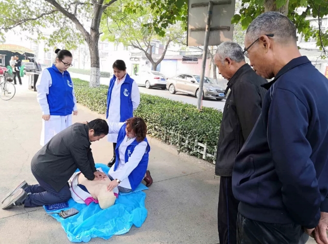 护士长吴小娜带领肿瘤四科护理团队现场对村委成员及村民进行心肺复苏急救技术普及培训。