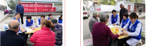 医院标建办主任张春香、肿瘤二科护师刘娟娟为村民量血压;肿瘤四科主管护师俞蕾为村民测血糖。