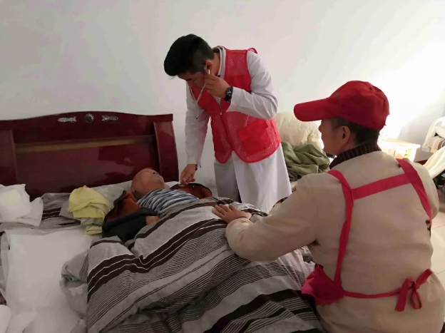 重症医学科副主任、副主任医师孙振杰每个房间巡诊,为卧床老人进行心肺听诊及健康体检,给予老人治疗建议及服药指导。