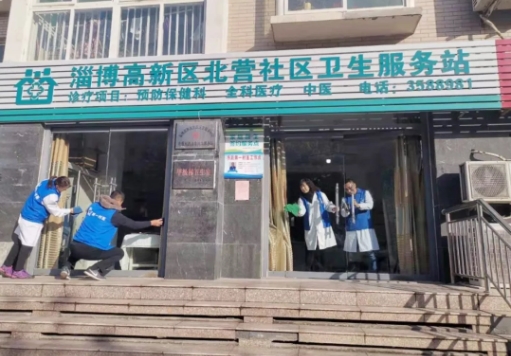 药剂科姜玉霞、徐文静、孙平、急诊科夏家信一行四人走进淄博市卫健委“第一村医”贺洪健派驻村淄博市高新区北营村社区卫生服务站,为前来就诊的村民进行日常用药知识、慢性病防治科普及测血糖、量血压,并协助卫生服务站进行卫生清理。