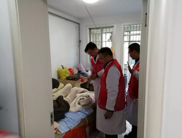 门诊医技党支部书记李祥峰、骨科副主任王宁、检验科主管技师赵鹏、彩超室主治医师罗超、查体管理科许立臣,主动上门走进罹患脑血管疾病瘫痪在床多年的居民家中看望慰问,进行体格检查并给予指导性治疗意见。