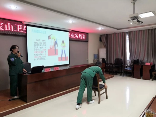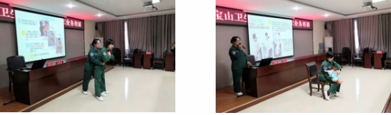 在急救技术培训环节,急诊科护士长刘健与主管护师张璞两人密切配合,重点讲解单人自救、双人互救及婴幼儿海姆立克急救法实施的体位摆放、具体手法及动作要领等,并根据个人急救技术操作手法给予现场讲评及技术指导。