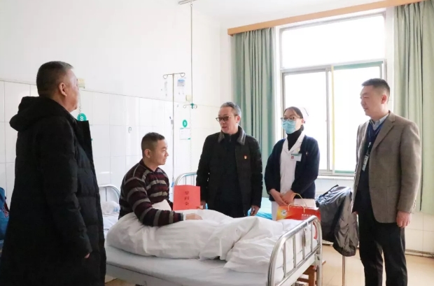 工会主席徐东带领相关科室负责人看望医院放射科职工王鑫,详细了解他的身体状况、治疗进展情况等,送去生活必需品和慰问金,鼓励他积极治疗,早日康复。