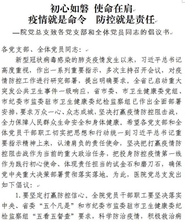 临床二支部发起倡议,要求全体党员担负起自己的责任和使命,积极报名到应急感染病区,救治确诊病人。