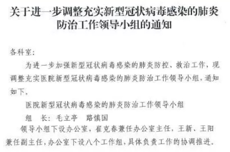 抗击疫情领导小组下设8个工作组,分别由党政领导班子成员担任组长,靠前指挥、敢于担当,通宵达旦研究部署抗击疫情任务、科学破解各种难题、困难,守土有责、守土担责、守土尽责。广泛动员群众、组织群众、凝聚群众,全院党员干部职工放弃春节假期,全员在岗值守,全院上下万众一心,众志成城,为抗击疫情提供坚强组织保障和政治保障。