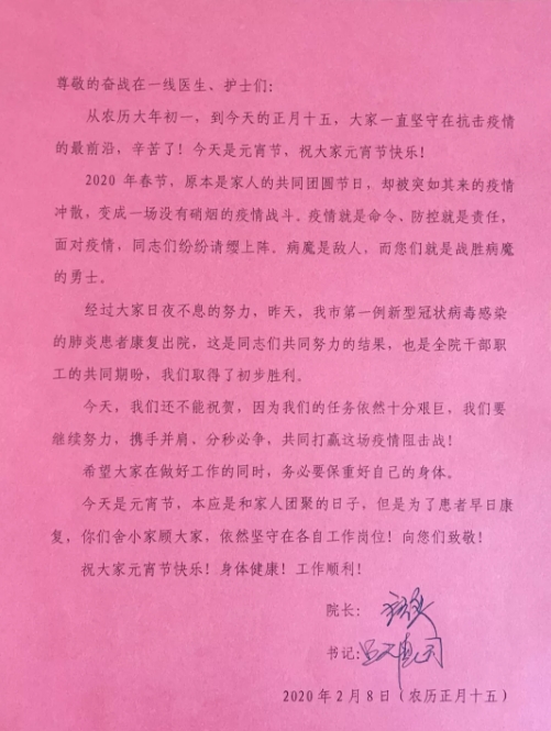医护人员纷纷表示:感谢一直以来领导、同事们的关心和支持,也祝同在抗疫战线上的所有医护人员及同事、全市人民元宵节快乐, 你们向往的春暖花开,就是我们奋战的力量,相信只要我们团结协作、齐心协力就一定能战胜疫情,大家一起加油!