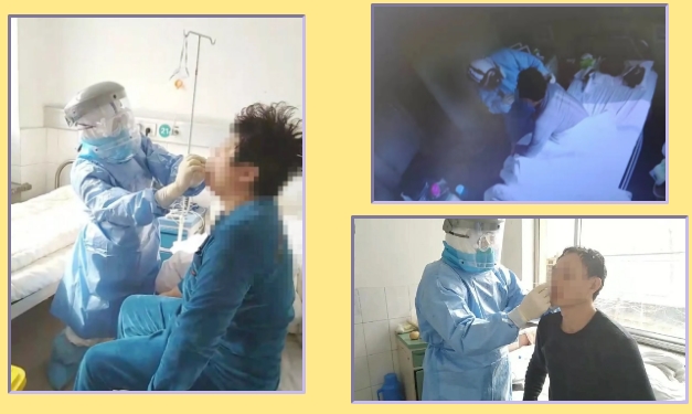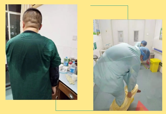 在应急感染病区工作,首先近距离面对病毒,新冠病毒不但具有高传染性且传播途径广泛,一线医护人员被感染的风险极高,为了更好的救治患者,做好防护至关重要,在全国防护物资紧张的情况下,我们尽量节省使用防护用品。防护有严格的规定和流程,穿上防护服,戴上口罩、护目镜,都会使人憋闷不适,由于长时间戴着医用N95口罩,常常使鼻梁和耳朵勒得红肿疼痛;摘下口罩时,脸上留下了深深的压痕甚至是血痕,身穿厚重的防护,不分昼夜坚守抗疫一线。只能以顽强的意志忍受着各种不适,因为收治患者,每每还要工作到深夜。大量的工作让高主任带领的第一梯度队9个人在前四天基本没有休息时间,只有实在困的时候才能眯一小会儿。即使这样,没有一个人叫苦叫累。随着来自各科室的医护兄弟姐妹的增援,原本不认识、不熟悉的同事,为了战“疫”,先后从内科、ICU、肿瘤科、感染科等不同科室汇聚而来组成一个临时的大家庭,不论是临近退休还坚守在一线的刘景春主任、毕德军副主任医师还是以往未曾谋面的护理姐妹,大家都心往一块儿想,劲往一处使,全身心的投入到救治患者的战场上,此时此刻,我们不光是同事,更是战友,尽管面临着艰苦卓绝的各种困难和考验,但我们依然克服万难,冲锋在前!因为疫情没有停止,战斗就没有结束。
