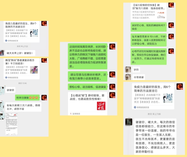我们每天都去病房和患者沟通交流,平时用电话和微信与患者“话疗”,指导他们在身体允许的情况下练习八段锦强身健体,促进康复,嘱其音乐疗法,看看书,跟家人和朋友视频聊天,尽量释放不良情绪,保持舒缓愉悦的心情,增强免疫力,促进康复的进程。同时给他们配送营养餐并提供生活必需品。