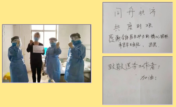 一开始,工作千头万绪。患者发烧、烦躁,有恐慌心理,质问我们能不能给他治好。我们理解患者的心情,耐心地为他做心理疏导,告诉他我们会一直守护着他,并第一时间与专家组会诊确定治疗方案,缓解他的紧张情绪。新冠肺炎确诊患者,他们的思想压力是巨大的。我们努力用爱心、耐心抚慰他们,时刻关心他们所需所想。告诉他们,虽然不能与家人团聚,但我们医护人员会一直陪着他们。
