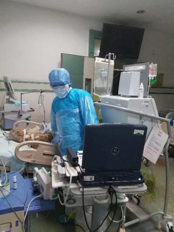 忙完了CT,接下来就是我们另一个神器要发挥作用了,那就是我们的床旁超声!新冠病毒主要侵袭肺部,同时大部分危重病人合并了心脏等多器官衰竭,而这些病人外出做一次检查不容易,所以重症医生的床旁超声,发挥了巨大的优势。有了超声,可以看肺里的情况、评估心功能、管理容量、引导穿刺、置管等一系列操作。超声是可视听诊器,是医生的另一双“眼睛”。忙完了CT,用超声为几个重病人做了评估,有两个病人心脏和容量有了动态变化,立即把数据进行了记录,并对战友们提出了预警,这样在下一步的诊疗中,大家就有的放矢了。