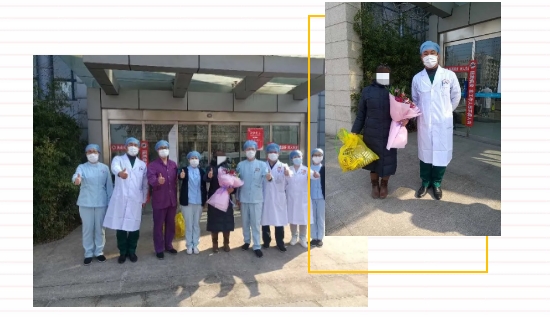 最高兴的时刻终于到来了,10:30要送郭阿姨等几位病人出院了。我们换好了衣服,一起把六位康复者从专用通道领出病房,媒体记者还有好多同事战友们已经等在了外面,大家为他们献上鲜花,送上美好的祝福,同时又反复交代出院后的注意事项。每个人都是开心的,都在感受着这小小的胜利时刻。康复者代表发表了感言,没有人彩排,没有人提前备稿,他们用自己最朴实的语言,表达了发自内心的感谢,我特别能体会他们此时酸甜苦辣的心情和康复的喜悦。