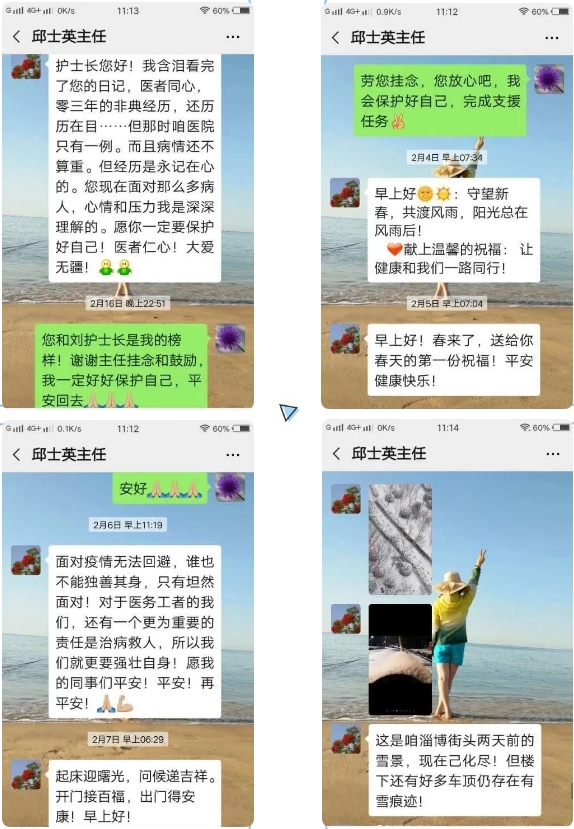 驰援湖北黄冈以来短短20几天,手机里已经存满了来自家乡父老的问候和嘱托,心中特别感动。我在疫区一线的一举一动时刻牵动着大家的心,其中有一位医学前辈自从得知我在黄冈一线,每天的问候都会在清晨如期而至,从未间断,她便是淄博市抗击非典一等功获得者,已经荣退的我院感染四科邱士英主任。