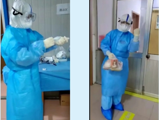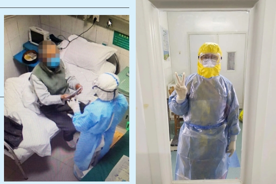 1月29日,大年初五,穿上防护服,初入应急感染病房,本有些担心我却一点儿也不害怕,跟在老战士身边问这问那,尽快熟悉环境和流程。办公区、隔离病房的卫生清理、消毒,医疗垃圾一袋一袋地运送,不间断的按要求收集病人生命体征,体温、脉搏、呼吸、血压、血氧饱和度、呼吸道症状、睡眠、饮食、疏导情绪等等事无巨细,抽动脉血、静脉血、留尿便标本、输液、注射、雾化治疗,给隔离的病人提水送饭、处理大小便等等……由于身穿防护服,行动不能和平时一样,戴着双层手套影响着操作的手感,不得不仔细再仔细,往往是这边正忙着打针,对讲机又从办公区发来呼叫,恨不得脚底生风,把任务完成的更好更快更多,减少下一个进隔离病房的战友的工作量,可现实是每一个人的工作都不少,病人病情特殊,治疗和处置随时变动!每次出隔离病房都是一脸一手的压痕,湿透的衣服让风一吹,又不禁冷得直打哆嗦。