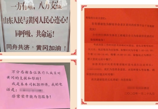 山东的父老乡亲怕我们不适应南方的饮食习惯,日夜赶工采摘制作,长途跋涉,只为让我们吃上家乡的馒头、水饺、煎饼、水果、蔬菜……我们有亿万山东人民做后盾,再大困难也不怕。各界人士的爱心捐赠,包括生活物品、保暖衣物、营养保健品、消毒防护用品、按摩理疗仪等应有尽有,只有我们想不到,没有他们送不到,尤其是黄冈志愿者熊先生等亲手采摘新鲜草莓送到酒店并代表黄冈人民送上感恩:“我们坚信,有你们在,黄冈一定行!”。