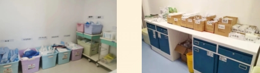 为了确保病区工作的有效衔接,每天早晨都会进行医护大交班,交班内容包括夜班患者病情,白班拟开展的工作以及需要注意的问题等。对患者诊疗方案的确定医疗组或是现场讨论或是微信群里群策群力,以期进一步优化,还会随时组织疑难病例会诊及病例讨论。各项工作流程也会以安全规范为基础进一步完善,尤其是涉及防护安全的各项工作,如:患者检验标本传递流程、护目镜浸泡流程、职业暴露处理流程等,其中我们的个人防护手册已升级到第五版。为了减少向污染区传递物品次数,保证隔离病房内物品的及时供给,库房内的备用物品种类繁多,查找时很是费时,因此我们利用现有资源对库房实行7S管理,物品标识清晰,定位放置,问题迎刃而解。条件不足,智慧来凑,确保患者及自身安全是我们共同的目标!
