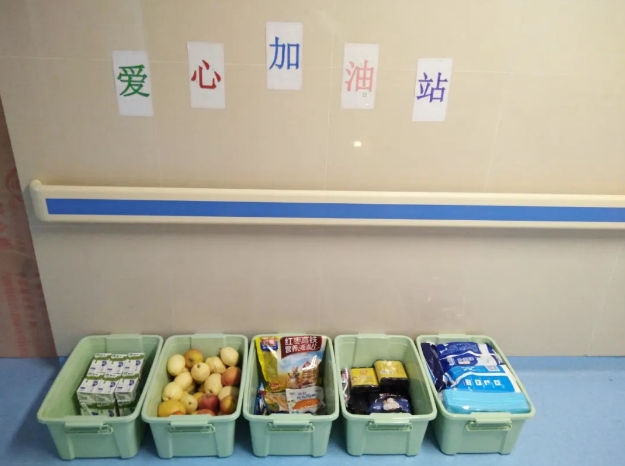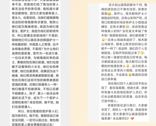由于病房是被紧急启用的,最初的一段时间物资供应短缺,尤其是生活用品。为了保证患者的日常生活需要,我们经常将队里下发或是酒店提供的洗发水、手霜、牙膏牙刷、拖鞋、袜子、纸尿裤等物品送给患者。巡视病房的时候也尽可能多的和患者沟通,着重了解他们的心理反应,当得知有些患者因为心情抑郁导致食不知味吃不下饭时,我们就将酒店每餐提供的水果攒下来上班的时候带到病房。患者感动之余反而都不好意思再开口,害怕给我们添麻烦,所以我们就在走廊内开辟了“爱心加油站”,主动给患者“输送”生活日用品和营养物资。山东省对口支援我们很多家乡特产,包括水果、营养品等,我们也会和患者一起分享。尤其是家乡的大苹果,非常受欢迎,患者们都高兴地说:“太好吃了,我们这边花钱都买不到呢!”患者们都很感激,除了无私的医疗援助之外,更多的是我们从来没有把他们当做传染源而刻意保持距离,会很自然的和他们交流、握手。这种暖心的感觉转院过来的患者体会更深刻,他们都夸赞我们的护理服务太好了,以至于多位患者都点名要到“山东人”工作的病区住院。我们经常会收到患者的感谢信,感谢我们对他们提供的“感动式”服务!有位康复出院的准妈妈通过微信表达了谢意:“在大别山医院的半个月不像在住院,更像是在度假,简直太幸福了……”我们也很幸福,让患者因住院而感到幸福就是我们全体队员最幸福的事!