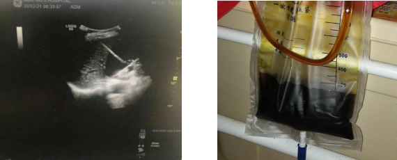 彩超定位,局麻,超声引导下将穿刺针经肝脏刺入胆囊内,抽出墨绿色胆汁。植入导丝,退针,使用扩张器顺导丝扩张通管,最后顺导丝置入引流管,拔出导丝,包扎固定。病人当日引流胆汁约240ml。术后一周病人肝功及皮肤黄染明显好转,为下一步外科手术赢得机会。