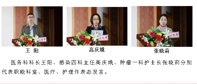 医务科科长王阳、感染四科主任高庆娥、肿瘤一科护士长张晓莉分别代表职能科室、医疗、护理作表态发言。