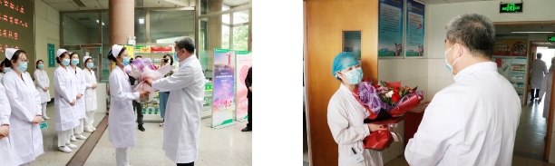 王可杰为感染科、肿瘤科护理人员送上献花和美好祝福,希望大家在今后的工作中,继续秉承仁道博爱精神,始终以守护人民群众生命安全和身体健康为使命,继续发扬伟大的抗疫精神,同舟共济、守望相助,以严谨的态度、敬业的精神践行呵护生命、维护健康的神圣职责;用真挚的关怀、优质的服务增进人民群众的健康福祉。