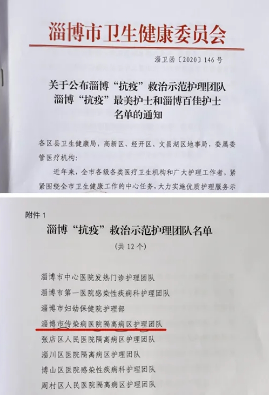 “5.12”国际护士节前夕,淄博市卫生健康委组织开展了淄博“抗疫”救治示范护理团队、淄博“抗疫”最美护士和淄博百佳护士系列典型推选工作。淄博市传染病医院隔离病区护理团队在新冠肺炎疫情防控阻击战中冲锋在前、坚守一线、勇于担当、无私奉献,荣获淄博“抗疫”救治示范护理团队荣誉称号。