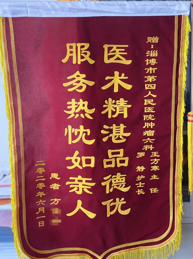 对于医生来说,锦旗就像是戎马倥偬军人璀璨夺目的勋章,是对医者的最高肯定。这日一早,方姨将一面上书“医术精湛品德优,服务热忱如亲人”的锦旗送到了淄博市第四人民医院肿瘤六科护士站,再三感谢王方寒主任、罗静护士长及科室全体医护人员对她的精心治疗和护理,让她积极面对自己的病情,有了战胜疾病的信心。