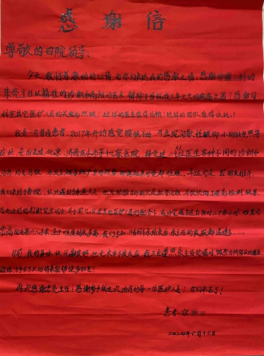 我是一名普通患者,2017年开始感觉腰腿不适,并出现间歇性跛脚,小脚趾变黑等症状,先后去过北京、济南及本市等十几家医院,接受过二十几位医生各种不同的诊断和治疗,均无疗效,而且呈越来越严重的趋势,脚疼起来时觉都难睡。幸运的是,经朋友推介,我们来到了贵院,认识遇到了朱亮大夫,他凭经验当即断定是血管问题,并很快做了造影检查,结果与他之前的判断完全吻合,并于前几日在其他医护人员的配合下,成功完成了这台历时三个多小时、难度非常高的支架介入手术,至于难度到底多高,我们不知,只看到手术结束后,朱主任的衣服都湿透了……