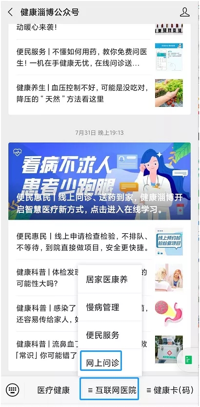 搜索健康淄博公众号,点击互联网医院——网上问诊