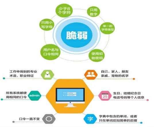 密码,我们每天都会用到,从访问电子邮件、登录网上账户、再到访问智能手机。密码是保护账户的最后一道防线。如果他人知道或猜测到我们的密码,便可以访问我们的账户,阅读邮件,观看信息,窃取我们的身份。所以,密码安全至关重要。什么是弱密码?默认密码、短密码、常见密码。
