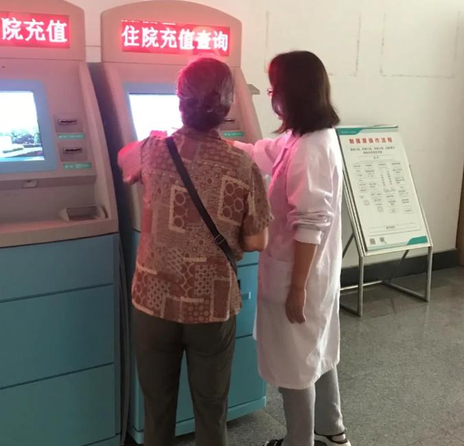 窗口排队就诊充值等待时间长时,门诊收费处人员轮流在自助机前指导患者使用自助机充值,方便快捷,减少了等待时间。