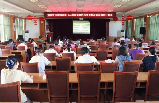 为进一步推动三级甲等传染病医院创建工作,持续提高医院管理能力和服务水平,近期,淄博市传染病医院标准化建设办公室组织召开“三甲”创建工作条款解读培训会,本次培训由副院长黄其来主讲,医、护、药、技、职能和后勤六大板块200余人次参加培训。