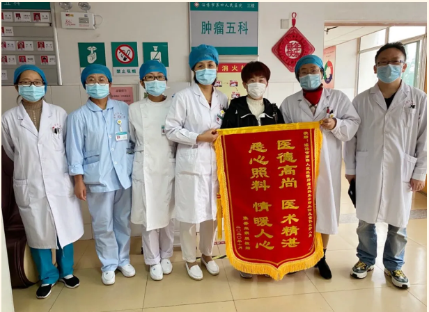 张大爷因肝癌、多处骨转移就诊于肿瘤五科,入院后,患者疼痛程度较重,生活质量极其差,为了缓解他的疼痛,肿瘤五科王素玲主任针对病情,认真地研究和落实治疗方案,为患者减轻痛苦,使他有了一段良好的生活。但因为患者病情进展速度快,慢慢的出现进食困难,大量腹水的症状,考虑到患者家庭经济情况,王素玲在减轻其家庭负担的基础上,给予患者最好的治疗。肿瘤五科的医护人员在生活上对患者进行多方面照顾、给予临终关怀,让患者家属极为感动。在张大爷去世几天后,肿瘤五科意外地收到患者家属送来的锦旗,上面写着“医德高尚 医术精湛 悉心照料 情暖人心”, 她感谢地说,“虽然我爸永远离开了我们,但正因为有你们无微不至的照顾,他走得安心、走得毫无牵挂,谢谢,谢谢你们!”
