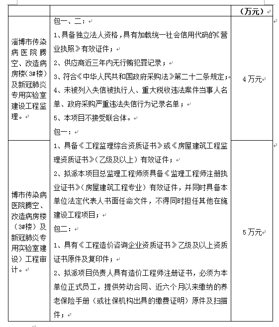 一、采购项目名称:淄博市传染病医院腾空、改造病房楼(3#楼)及新冠肺炎专用实验室建设工程监理、审计