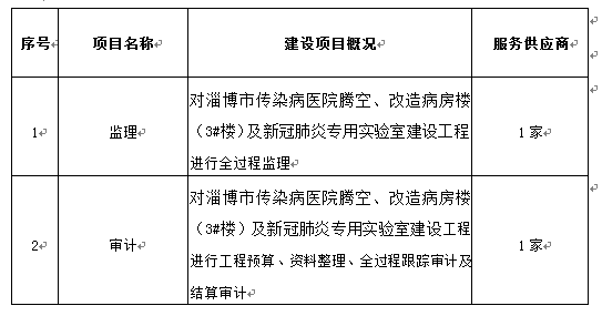 淄博市传染病医院腾空、改造病房楼(3#楼)及新冠肺炎专用实验室建设工程监理、审计项目进行竞争性磋商招标,欢迎合格的供应商前来洽谈。
