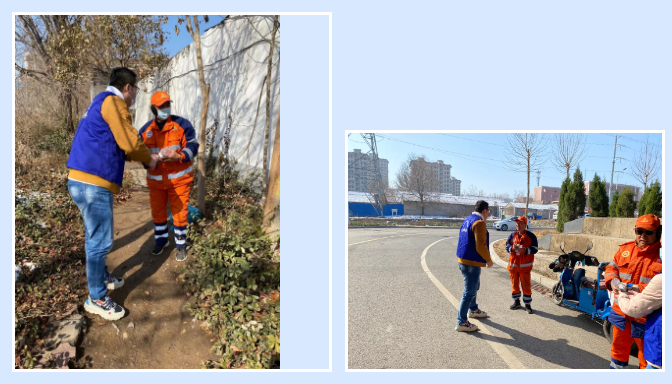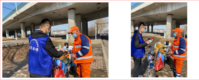 淄博市第四人民医院学雷锋志愿服务队为环卫工人送上了水和牛奶等慰问品,用爱心向环卫工人表达了敬意和慰问。一位环卫工人说:“这份工作很辛苦,长达两公里的马路都是我的工作区域,累了就在路边休息,下雨时只能在桥下避雨,但是能让我们的城市更加美丽,我感到非常幸福!感谢你们的理解和关心!”随后,学雷锋志愿服务队的队员们协助环卫工人捡拾垃圾,成为美化城市环境的一员,以实际行动诠释了“雷锋精神”,传播了文明、奉献、爱心、服务的新风尚。干净整洁的城市面貌与每一位环卫工人的辛勤劳动是分不开的,他们在平凡的岗位上做着不平凡的工作。学雷锋志愿服务队的队员们表示,向雷锋学习,就是要从小事做起,从身边做起,从自身做起。让我们一起学习雷锋精神,共同守护美丽家园,致敬中国共产党成立100周年。