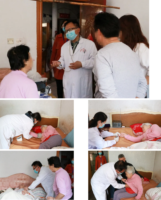 党员志愿者手提诊疗物品,在朝阳社区居委会网格员的带领下,走进心脑血管疾病、行动不便的患者家中,为其测血糖、量血压,进行体格检查,并结合患者症状体征,与家属详细交流指导治疗方案。