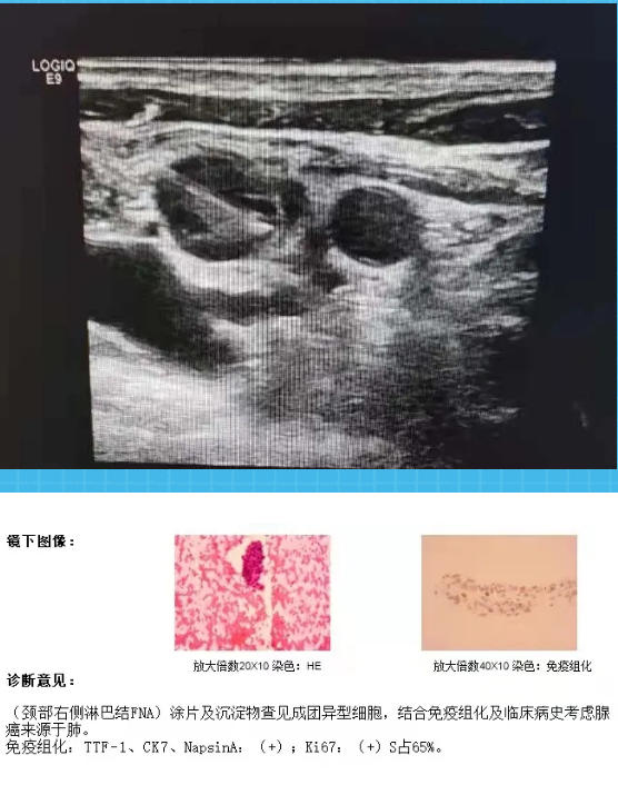 由于淋巴结的“个头”已经到了1.2x0.9cm,又紧邻颈动脉及颈内静脉,所处位置危险,淋巴结的性质关系到手术及今后的治疗方向,顿时这个令人“头疼”的淋巴结让张叔叔一家紧张起来。经过与医生的讨论,决定选择超声引导下细针穿刺活检。术后病理提示腺癌,考虑来源于肺,为临床下一步治疗提供了有利依据。