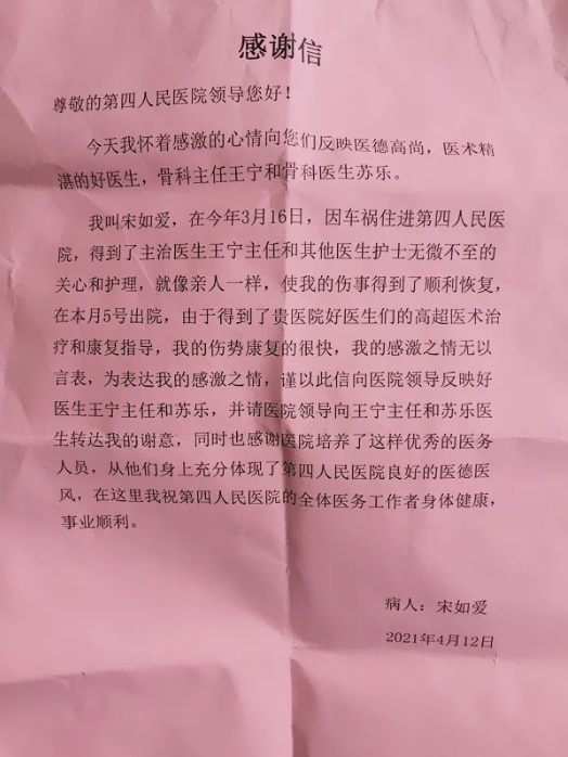 还记得那位因车祸致股骨颈骨折的大姨吗?她又来到了淄博市第四人民医院骨一组,这次还特意带了一面锦旗和感谢信:“我这次来就是专程感谢咱们的医护人员,我能顺利康复多亏了你们。”