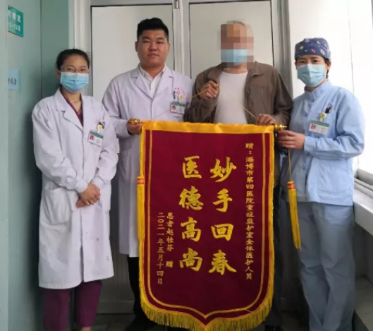 近日,淄博市第四人民医院重症医学科收到了患者赵某某家属送来的一面上书“医德高尚 妙手回春”的锦旗,真挚表达了患者及家属对重症医学科全体医护人员的感激之情。