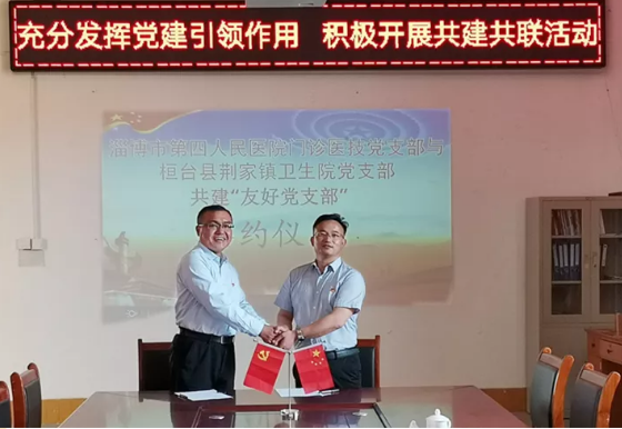 2021年5月17日,淄博市第四人民医院临床三支部与淄川区龙泉卫生院党支部共建“友好党支部”签约仪式在龙泉镇中心卫生院举行。