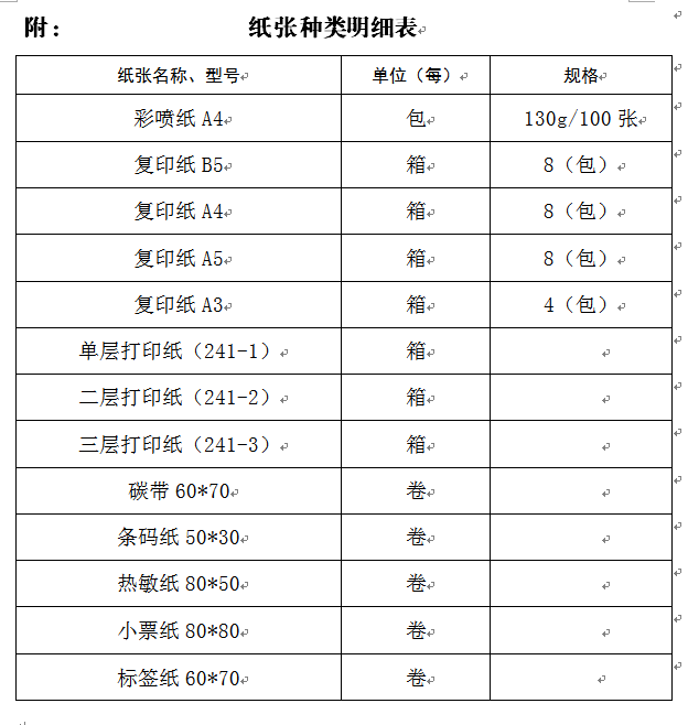 按照国家相关部门质量技术要求,采购各类型号打印纸、复印纸等。推荐品牌乐透、欣乐等。投标方带产品样品。附品种明细表。