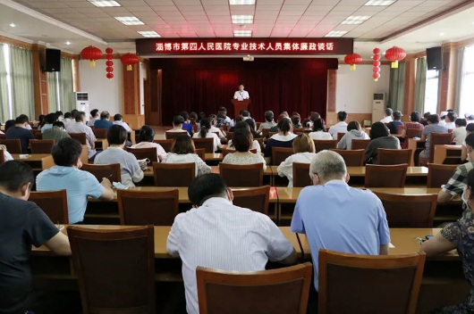 为进一步加强医院专业技术队伍素质建设,做好日常监督提醒、教育管理工作,增强专业技术人员守纪律、讲规矩、廉洁自律的意识,不断激发干事创业的工作状态,营造风清气正的政治生态,落实好“两个责任”。2021年8月3日下午,淄博市第四人民医院党委书记郭平同志对专业技术人员进行了集体廉政谈话。
