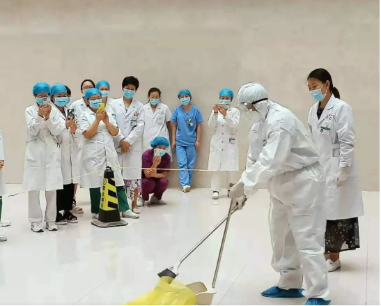 单业香首先进行手卫生、规范佩戴口罩及含氯消毒剂的正确配置、使用等强化培训,随后进行演练。