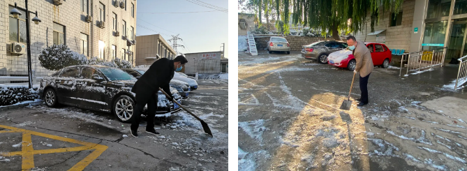 立冬酷寒,人心至暖。清扫现场,热火朝天。大家拿起铁锹、扫帚等除雪工具扫雪铲冰,配合默契,干劲十足。经过两个多小时的全力奋战,将医院重点区域和主要道路积雪清理完毕,这群人也成为这个冬日清晨一道最美的风景。