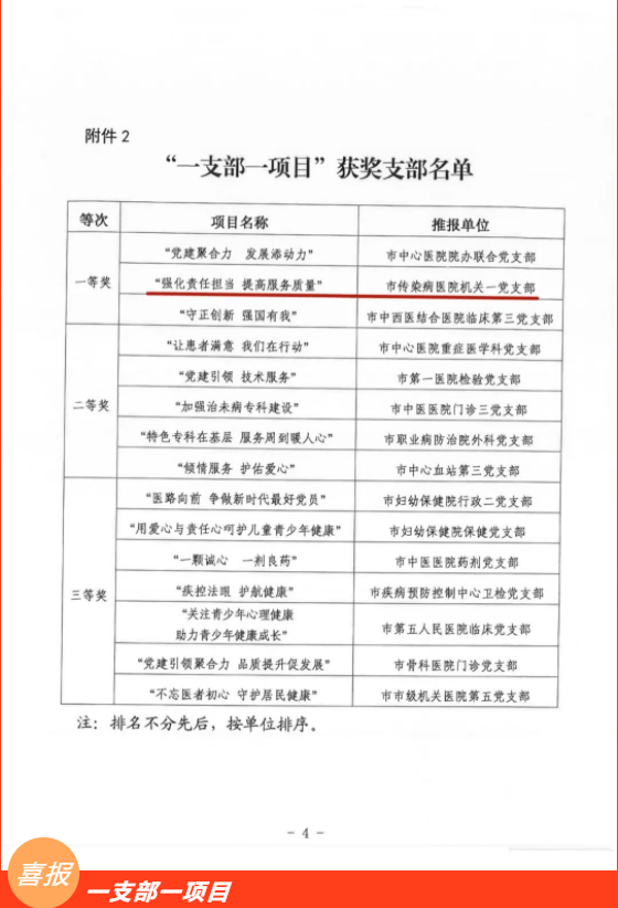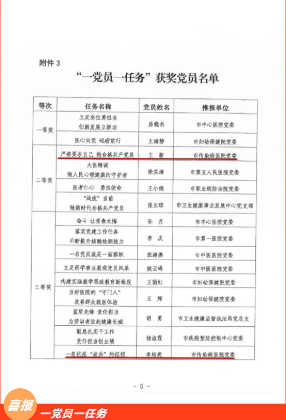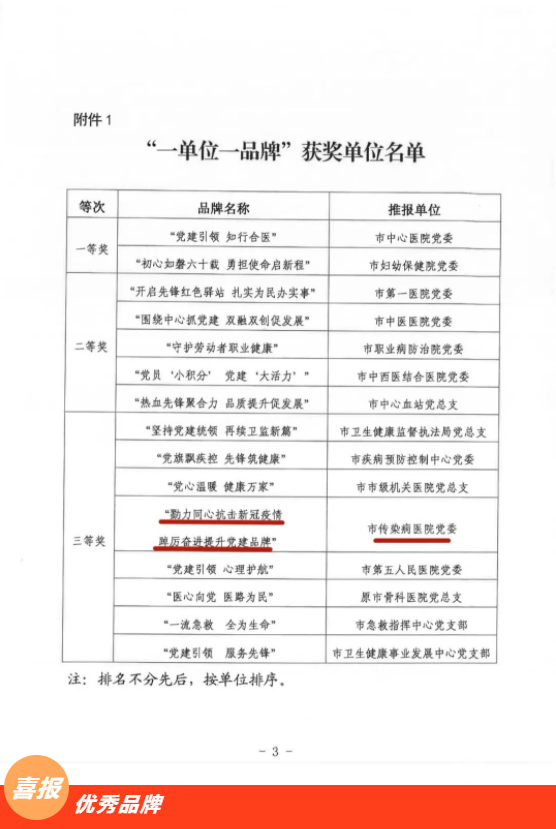 淄博市传染病医院党委“勠力同心抗击新冠疫情 踔厉奋进提升党建品牌”荣获优秀品牌,机关一支部荣获“一支部一项目”一等奖,王新、李培亮分获“一党员一任务”二等奖、三等奖。