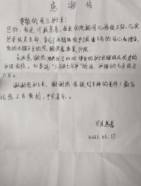 他曾因身体不适入住感染三科,因自身疾病心理压力较大,手足无措,一度产生了消极的思想,而感染三科医护人员对他极为认真和负责任的态度,不仅让他无措的情绪得到缓解,同时感到倍加温暖。