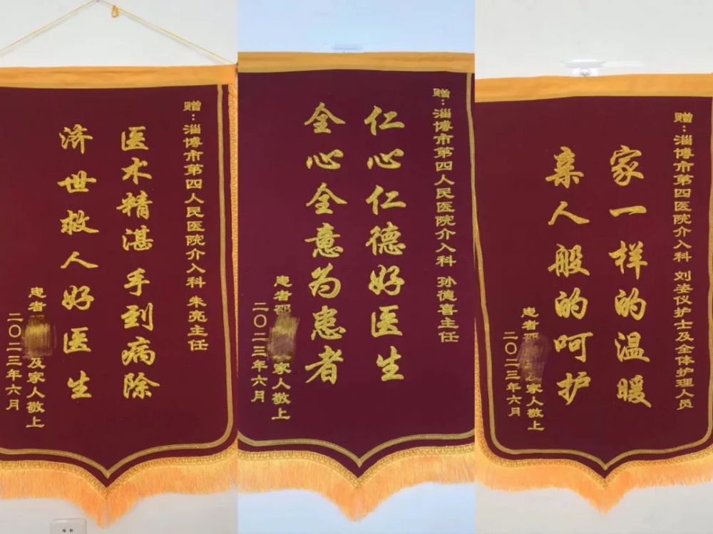 近日,淄博市第四人民医院介入科患者邵先生的家属送来三面饱含感激之情的锦旗,“医术精湛手到病除 济世救人好医生”“仁心仁德好医生 全心全意为患者”“家一样的温暖 亲人般的呵护”。收到同一个患者的三面锦旗这还是头一回,锦旗里不仅承载着患者对介入科医护人员的感激,也证明了患者对科室医术和护理的认可与肯定。