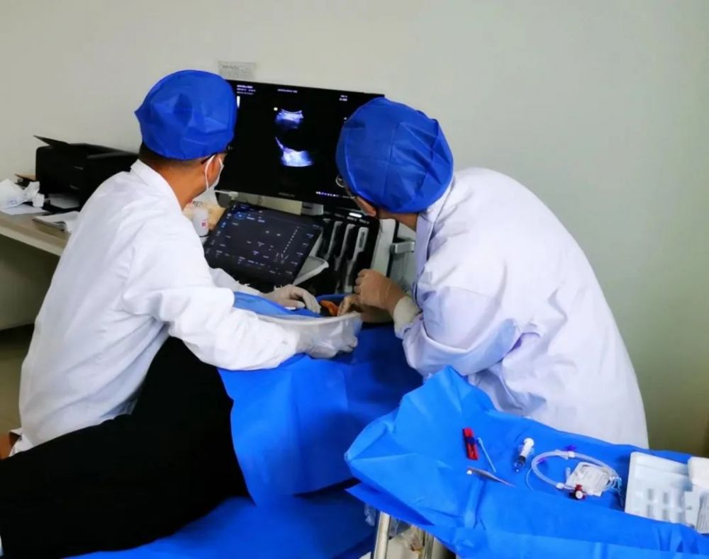 经超声检查发现,患者肝内多发类囊性团块,考虑脓肿。因患者年龄较大,手术耐受程度差,内三组主治医师韩凯与超声科会诊,超声科主任邵宏增、主治医师高珊珊根据患者病情制定详细的治疗方案,因常规手术创伤大,术后恢复困难,最终决定采用超声引导下经皮肝脓肿穿刺置管引流术。