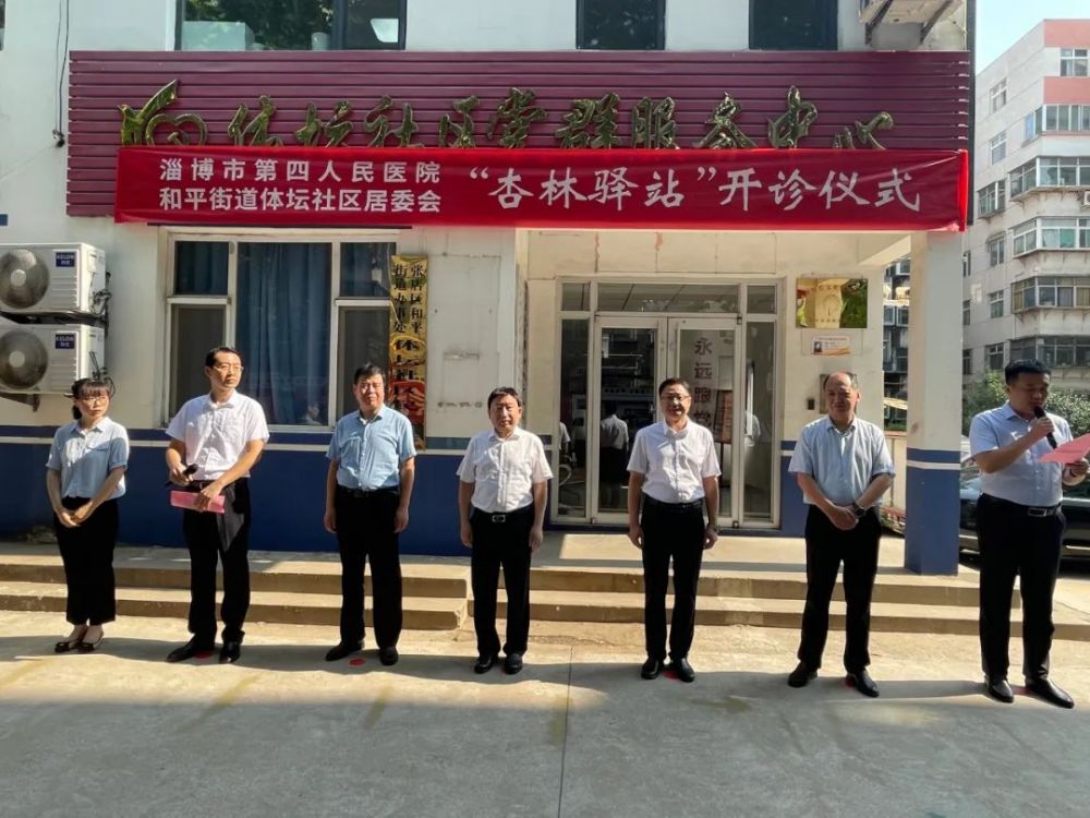 淄博市第四人民医院党委副书记、院长王忠德,区政府副区长刘正道共同为体坛社区“杏林驿站”揭牌。