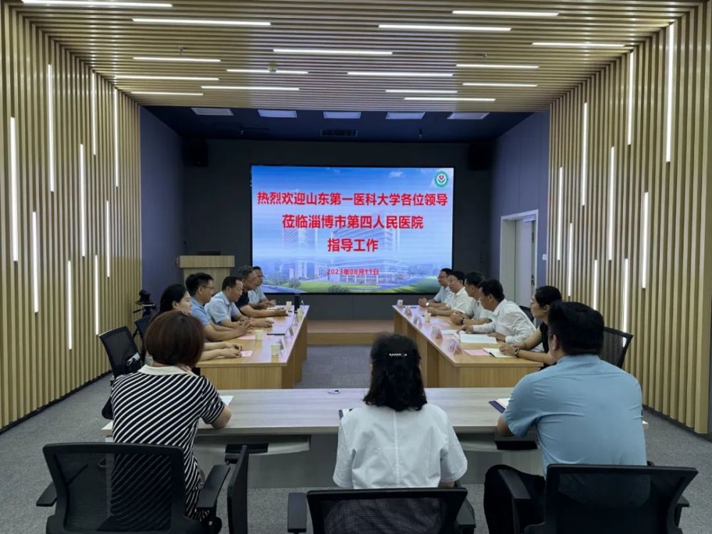 8月11日上午,山东第一医科大学(山东省医学科学院)党委委员、副校(院)长李栋、山东第一医科大学(山东省医学科学院)成果转化与产业部(服务地方经济办公室)部长(主任)李胜等一行到淄博市第四人民医院交流参访。淄博市卫生健康委党组成员、副主任张恒龙,淄博市第四人民医院党委书记郭平、院长王忠德及院领导班子成员、相关科室负责人参加座谈交流。