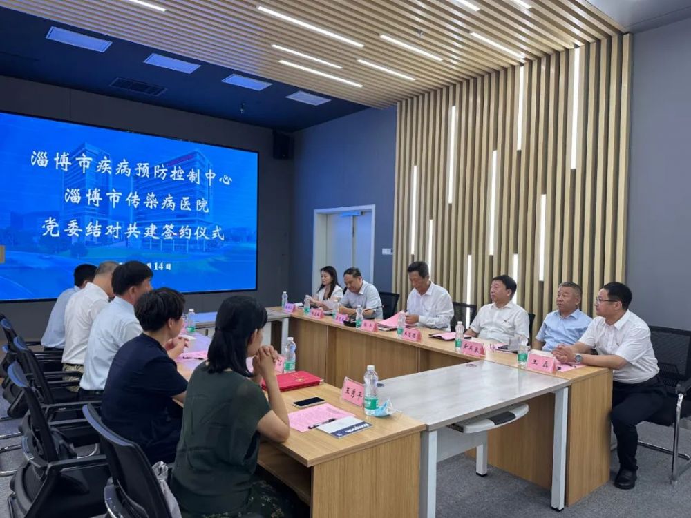 为夯实党建基础,促进优势互补、资源共享、协同发展,提升党建与业务一体化发展质效,2023年8月14日上午,淄博市卫生健康委党组成员、淄博市疾控中心党委书记李全营,市疾控中心党委副书记、主任崔峰率中心成员赴淄博市传染病医院开展党建结对共建活动。淄博市传染病医院党委书记郭平,党委副书记、院长王忠德出席,双方领导班子成员、各党支部书记和相关科室负责人参加活动。